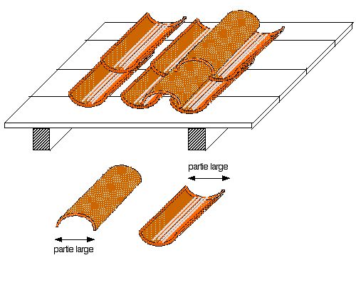 Pour la pose sur ue surface continue, les tuiles de courant (de dessous) sont posées, calées par des débris de tuile ou scellées au mortier de chaux ou batârd jamais au ciment pur. Elles sont alignées par le cordeauen suivant la ligne de la plus grande pente. La partie la plus évasée (plus large) est placée vers le faîtage (vers le haut) en respectant les recouvrements. Les tuiles de couvert (de dessus) sont posées à cheval sur les précedentes en respectant les mêmes recouvrements. La partie évasée la plus large, au contraires des première est placée vers l'égout (vers le bas).